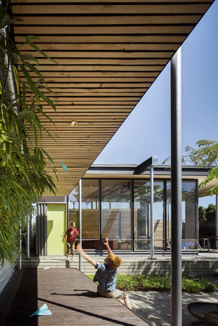A studio and guesthouse for a family with three small children. The main house and studio are linked by a covered breezeway, integrating landscape and architecture to make a private courtyard for playing, dining, and parties. Built primarily of recycled materials, sustainability and economy are maximized.
