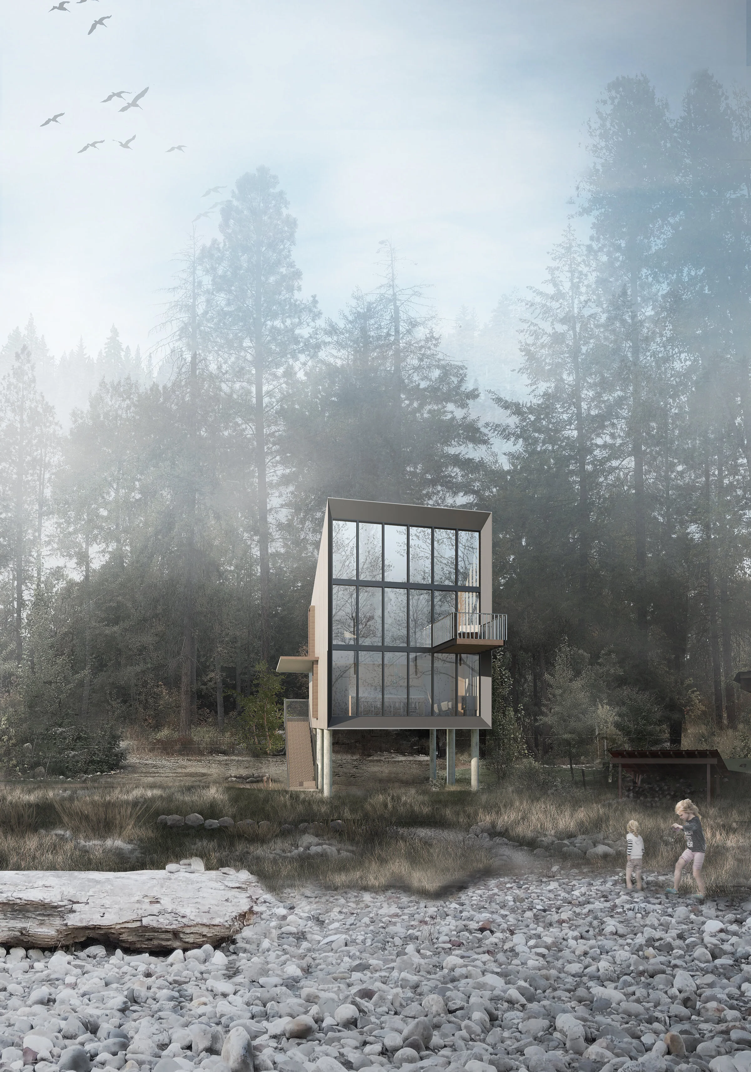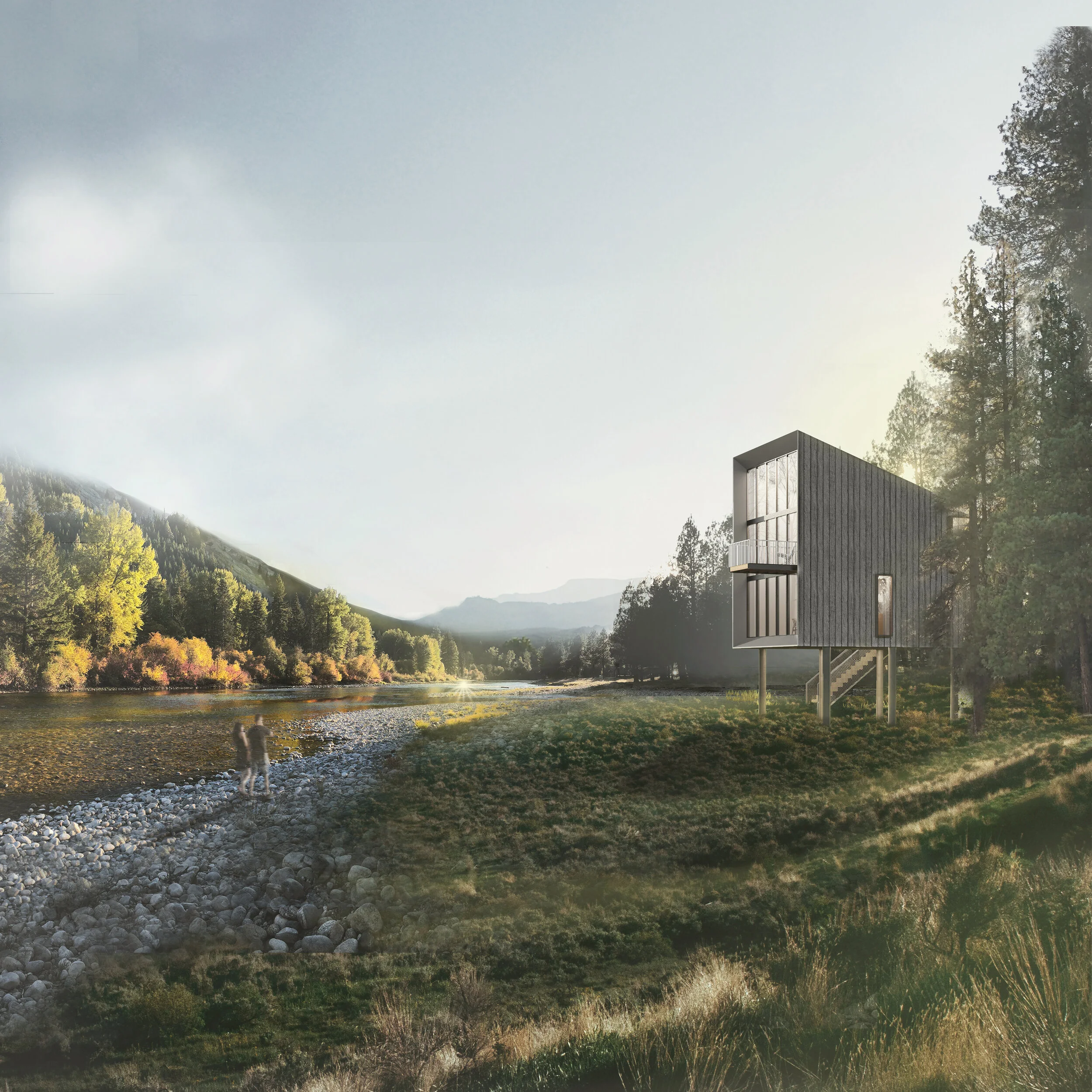 The Wenatchee River Cabin is a one-bedroom retreat that strives to create a harmonious relationship between shelter and nature. Molded by the natural forces of the Okanogan Wenatchee National Forest and the Wenatchee River, the design seeks an interdependence between the surrounding ecosystems and the architecture.